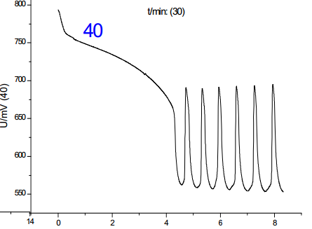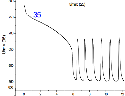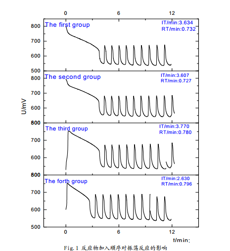從圖中可以看出:在這四種情況下,體系均可以產(chǎn)生化學(xué)振蕩,但是誘導(dǎo)時(shí)間和振蕩周期略有差別。其中,第二組的體系振蕩周期**短,第四組的誘導(dǎo)周期**短。從理想的反應(yīng)體系分析,振蕩的發(fā)生和振蕩周期應(yīng)該與反應(yīng)物質(zhì)的加入順序基本無(wú)關(guān),因而基本相同,加入順序主要會(huì)影響到反應(yīng)的誘導(dǎo)時(shí)間,但從實(shí)驗(yàn)結(jié)果看,雖然四組反應(yīng)振蕩周期和誘導(dǎo)時(shí)間基本一致,但是又略有差別,忽略反應(yīng)偶然因素分析認(rèn)為: