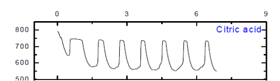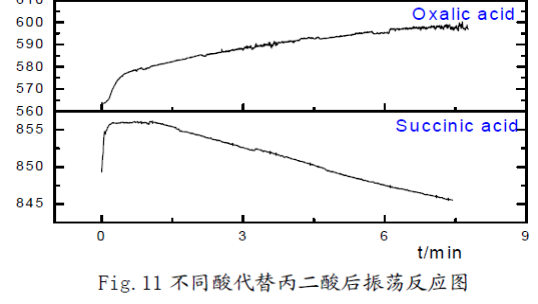 (1) 用0.45M丁二酸、0.45M乙二酸、0.45M檸檬酸代替丙二酸后,僅有蘋果酸、檸檬酸可以觀察到振蕩現(xiàn)象,乳酸沒(méi)有振蕩現(xiàn)象但是出現(xiàn)異?,F(xiàn)象。