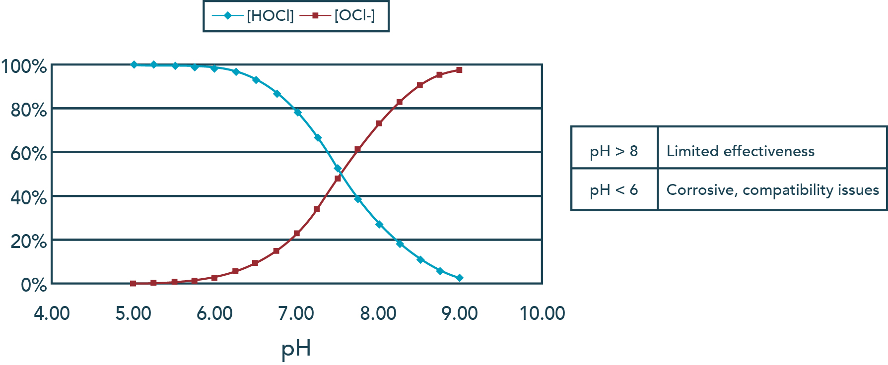 氯可以作為游離氯或氯胺存在。兩組都可以氧化化合物并實(shí)現(xiàn)治療目標(biāo),但是,需要更多的氯胺來(lái)滿(mǎn)足相同的氯需求。游離氯測(cè)量分別考慮水中的離子形式和質(zhì)子化形式的氯,OCl-和HOCl。在這兩者中,HOCl(次氯酸)是更強(qiáng)的氧化劑,并且在7.5的pH下是主要的。